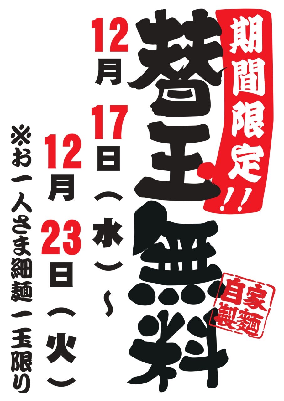 ラーメン工房ふくやより、日頃ご来店頂いてる皆様に 感謝の気持ちを込めて替玉無料祭を開催致します。 期間は12月17日~12月23日までの1週間、 ラーメン工房ふくや別府総本店・アミュプラザおおいたで開催致します。 期間中はラーメンを頼んでいただいたお客様1杯につき替玉を1玉無料でご提供させていただきます!